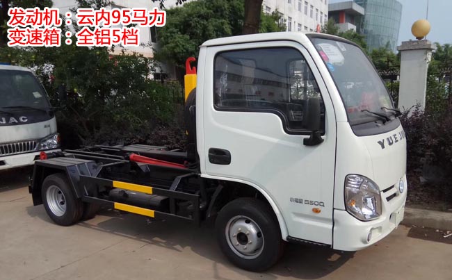 躍進小福星勾臂式垃圾車,上汽躍進底盤,云內德威95馬力,柴油發(fā)動機,全鋁5檔變速箱,軸距2.8米,輪胎型號185R14重型后雙胎,前盤制動。