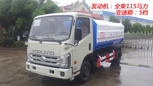 福田康瑞掛桶式垃圾車,康瑞車身、1860mm寬單排前翻駕駛室、全柴115馬力發(fā)動機,5檔、7.00R16鋼絲胎、動轉(zhuǎn)、ABS、可調(diào)方向盤、電控熄火。