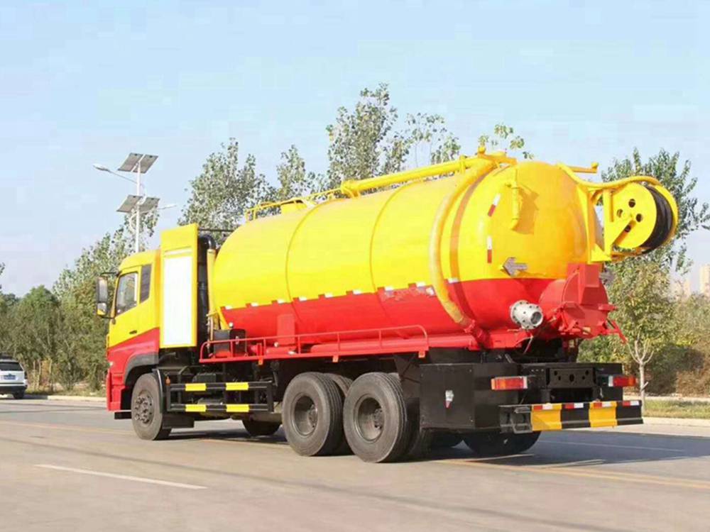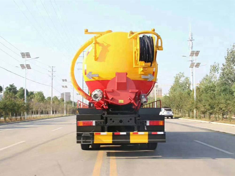 清洗裝置:配天津通潔300升高壓泵, 60米PVC雙層高壓管22通徑高壓管,10個高壓噴頭,兩個水泥蓋,頂部100的互通,水污互通用100的球閥,水罐3寸球閥安在罐體最底部.水倉污倉罐體內噴防銹,后封頭600的液壓口,一個6寸自流,一個4寸的進料口,一個4寸的排污口,側面一個6寸的球閥偷排。后蓋加裝活動可拆式卷盤壹套,右后側一套卷盤,罐體采用8個厚鋼板制作,后蓋上帶一個600液壓口排污,300側邊自流口。