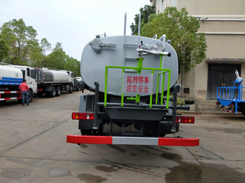 灑水車標配::前沖(噴),后灑,帶側(cè)噴(側(cè)花灑),后置工作平臺,平臺上安裝高壓炮(炮噴射形狀可調(diào)成直沖狀、大雨、中雨、毛毛雨、炮可360度旋轉(zhuǎn),射程>30米)。帶自流閥,消防接口。帶自吸泵,可將池塘的水直接吸入罐體內(nèi)也可直接從城市街道消防栓上連接注水,吸入罐體內(nèi)。罐前量管(觀察罐內(nèi)水位)、罐后爬梯、罐上罐口帶簡易護欄、罐側(cè)雙炮筒,罐體表面雙層油漆工藝,防銹、耐腐蝕