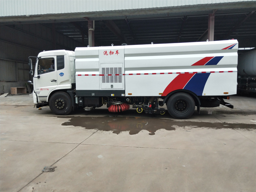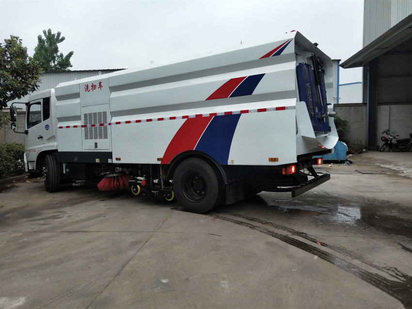 掃路車采用吸掃混合的方式收集垃圾,濕式除塵、電液控制,液壓傾翻卸料的作業(yè)方式對路面進行清掃作業(yè)。掃路車采用“中置四掃盤+噴霧降塵裝置+中心隔板+后置吸嘴”的結構布局,讓清掃過程中砂石不在飛濺揚塵,此布局便于清掃裝置與吸盤的調整與維護,轉場作業(yè)時整車通過性好。