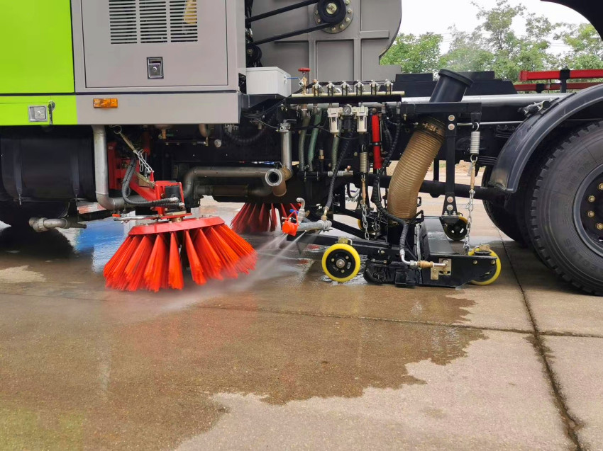 二、采用“中置兩立掃+中置寬吸嘴(內(nèi)置高壓水噴桿)+左右高壓側(cè)噴桿”的結(jié)構(gòu)。