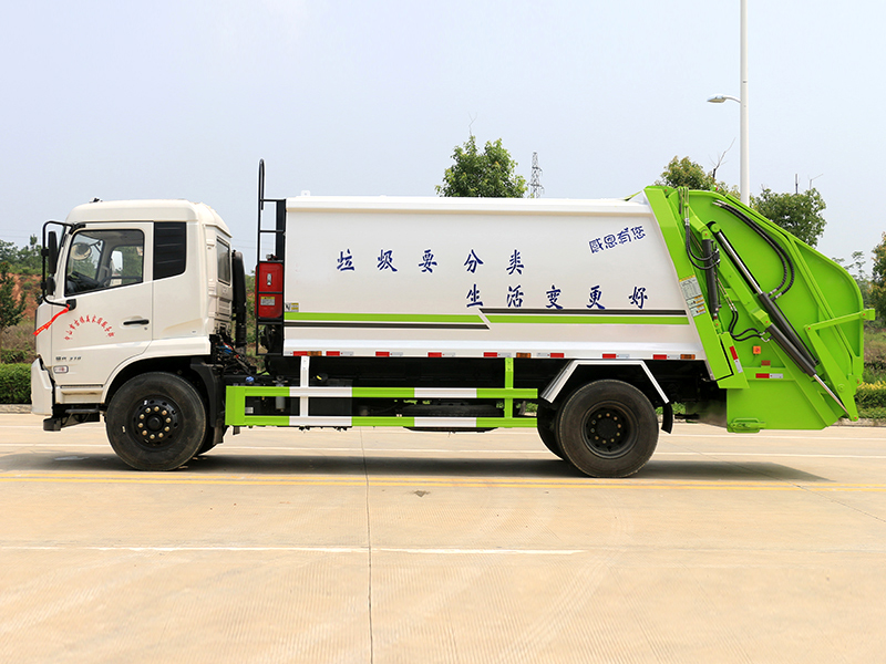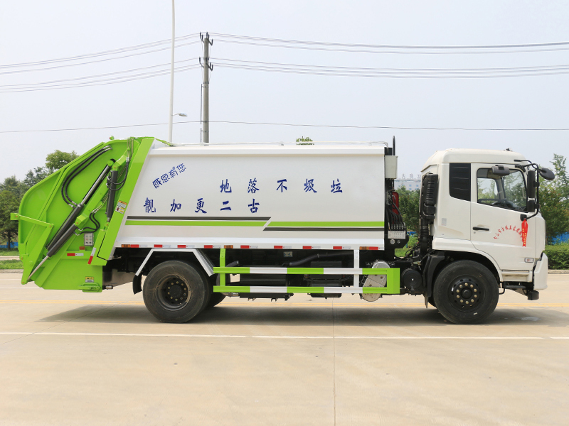 新款平面弧形廂體,廂體材料為武鋼優(yōu)質碳鋼,外箱尺寸:8890×2500×3300mm,有效壓縮容積12-14立方,PLC一鍵操作控制,手電一體操作模式,兩側雙電控,帶駕駛室內操作,底板支撐加強,雙向壓縮,開放式易清潔污水箱。壓縮式垃圾車采用機電液一體化技術,借助機、電、液聯合自動控制系統(tǒng)、電腦控制、手動操作系統(tǒng),通過填裝器和推鏟等專用裝置,實現垃圾倒入、壓碎或壓扁、強力裝填,把垃圾擠入車廂并壓實和推卸,污水全部進入污水收集箱,解決了垃圾運輸過程中的二次污染的問題。壓縮式垃圾車具有自動反復壓縮以及蠕動壓縮功能,壓縮比高、密封性好、裝載量大﹑操作方便、環(huán)保性好﹑整車利用功率高等優(yōu)點。