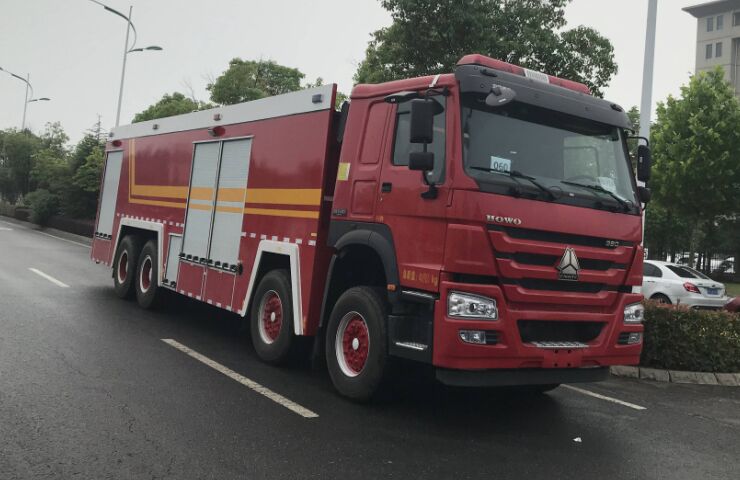 重汽豪沃24噸泡沫消防車,采用重汽豪沃ZZ5437V4667E1底盤(pán)改裝而成。整車由消防員乘員室和車身兩大部分組成,乘員室為一排半,可乘坐2人,該車為外露罐結(jié)構(gòu),車身前部為水罐,后部為泵房。載液罐體為優(yōu)質(zhì)碳鋼,與底盤(pán)采用彈性連接,載水20450kg(PM160),泡沫液量3100kg(PM240),裝備了上海茸申消防器材有限公司生產(chǎn)CB10/80型常壓消防泵,額定流量80L/S,車頂安裝成都威斯特消防機(jī)械有限公司生產(chǎn)的PL64(PM240)型車用消防炮。該車最大的特點(diǎn)是載液量大、操控性好、維修簡(jiǎn)便?蓮V泛應(yīng)用于公安消防隊(duì)、廠礦企業(yè)及社區(qū)、碼頭等場(chǎng)所,撲救大型油脂類火災(zāi)或一般性性物質(zhì)火災(zāi)。