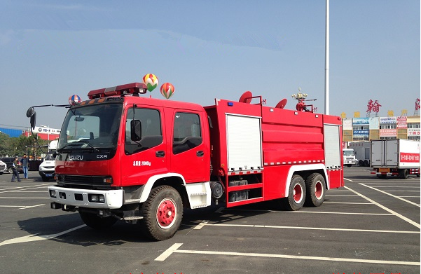 五十鈴11-12噸雙橋消防車采用慶鈴QL1250WPFZY底盤改裝,平頭雙排駕駛室,五十鈴6HK1-TCH發(fā)動機,300馬力,罐體容積11-12立方米(水罐容積8立方米,泡沫罐容積3立方米);整車結(jié)構(gòu)緊湊,方便靈活,動力性能好,車速高,能自由進出鄉(xiāng)村狹窄道路及小區(qū),具有大型消防車的全套消防功能,上裝箱體的上裝骨架全部采用引進歐洲技術(shù)生產(chǎn)的鋁合金型材制造,整車的重量減少,機動性能和整車載重量提高。除了裝備消防水泵及器材以外,還設(shè)有較大容量的貯水罐及水槍、水炮等?蓪⑺拖廊藛T輸送至火場獨立進行撲救火災(zāi)。也可以從水源吸水直接進行撲救,或向其他消防車和滅火噴射裝置供水。在缺水地區(qū)也可作供水、輸水用車,主要適用于大中城鎮(zhèn)、鄉(xiāng)村狹窄街道、城市小區(qū)、繁忙的批發(fā)市場等場所的一般物質(zhì)滅火,閑暇時可用于園林噴灌、道路清灑。