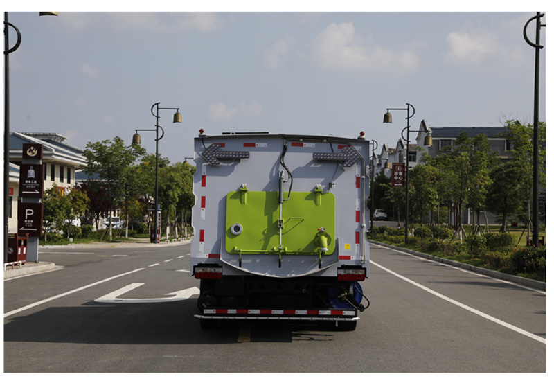 6)具備倒車(chē)保護(hù)裝置,在作業(yè)過(guò)程中如遇緊急倒車(chē),智能化的控制系統(tǒng)會(huì)自動(dòng)停止作業(yè)并收回掃盤(pán)、吸盤(pán)和側(cè)噴桿;具有防止舉升垃圾箱翻車(chē)保護(hù);具有檢修安全保護(hù)。