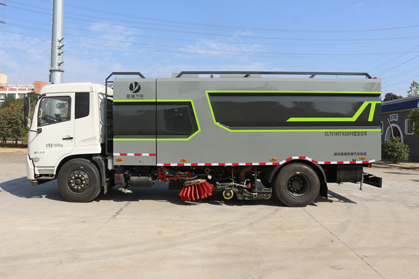 1.CLT5180TXSD6型洗掃車適用于城市道路、高速公路、廣場、機場、碼頭、遂道、橋梁、隔離墻避、路緣和路緣石立面的機械化清洗、清掃、噴霧降塵等清潔作業(yè)。具有路面清洗、路面清掃、路緣清洗、路緣和路緣石立面洗刷、低壓沖洗、噴霧除塵等多功能。有“全洗掃”、 “右洗掃”、 “全掃”、 “右掃”4種作業(yè)模式可選擇。選擇“全洗掃”模式清洗廣場和路面,清洗效率高效果好,洗凈率達90%以上。選擇“左洗掃”或“右洗掃”模式清洗路面和路緣、洗刷路緣石立面。需要進行路面清掃或路面保潔作業(yè)時,可選擇掃路模式。需要噴霧除塵時,可開啟噴霧裝置,進行噴霧除塵作業(yè)?梢韵駷⑺囈粯訉β访孢M行低壓沖洗作業(yè)。