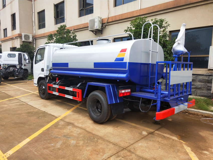 罐體容積:5立方米,鋼板為4mm碳鋼Q235材質(zhì)專用容積版制作,罐內(nèi)隔板具有防波作用,以減輕汽車行駛時罐體液體沖擊;配大功率專用灑水泵,泵可自吸自排;前封頭帶水位計,后平臺主管路帶1寸澆花接口,后爬梯,帶1個消防接頭,帶1個自流閥,1個過濾裝置。