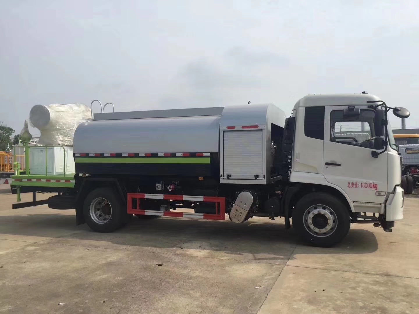 整車說明:專用裝置為抑塵霧炮,用于城市抑塵。整車長(zhǎng)/軸距/后懸對(duì)應(yīng)關(guān)系為(mm):7890/3950/2540;8300/4200/2700;8700/4500/2800;9150/4700/3050;9150/4700/3020;9600/5000/3200;9900/5300/3200;10250/5800/3050.防護(hù)材料:Q235A碳鋼,連接方式:左右側(cè)面采用焊接連接。后下部防護(hù)采用螺栓連接,后部防護(hù)斷面尺寸(mm):120×50,后部防護(hù)離地高度(mm):490。ABS型號(hào)/生產(chǎn)廠家:3631010-C2000/東科克諾爾商用車制動(dòng)系統(tǒng)(十堰)有限公司,ABS 8/東科克諾爾商用車制動(dòng)系統(tǒng)(十堰)有限公司, 4460046450/威伯科汽車控制系統(tǒng)()有限公司。隨底盤選裝駕駛室。選裝霧炮型號(hào):WF-60/WF-80/WF-100所對(duì)應(yīng)的整備質(zhì)量分別為:9650kg/10600kg/11300kg。選裝外形圖片。